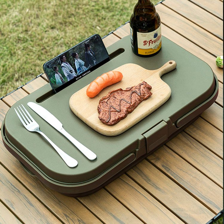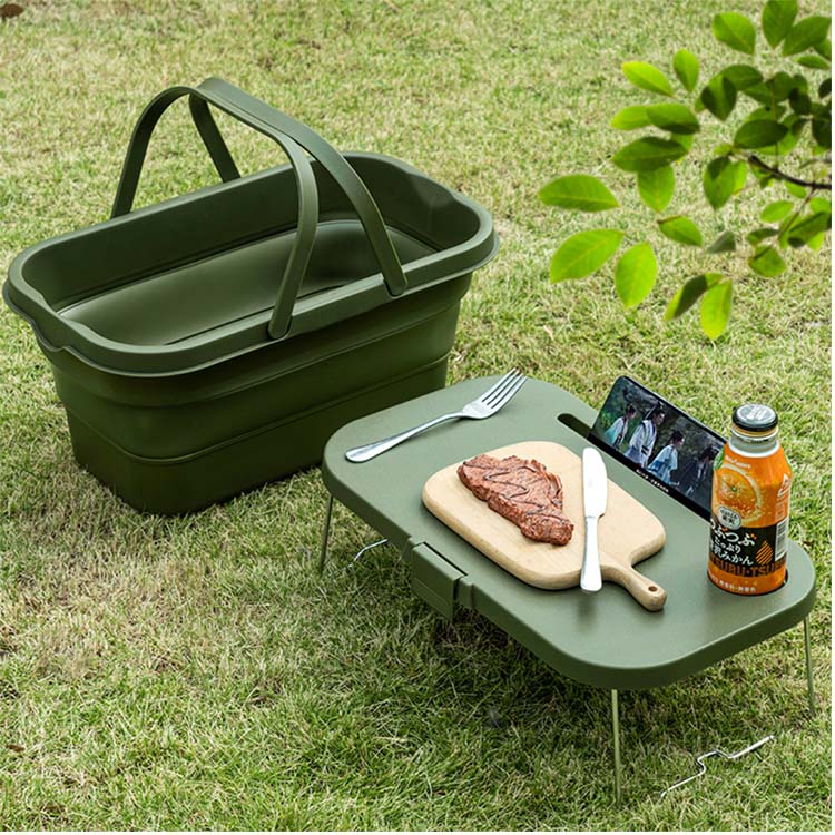 Dieser innovative Korb verwandelt sich in Sekundenschnelle von einem tiefen Aufbewahrungsbehälter in eine flache, stabile Tischoberfläche und bietet sowohl organisierte Aufbewahrung als auch eine praktische Servier-/Essplattform für Outdoor-Aktivitäten.