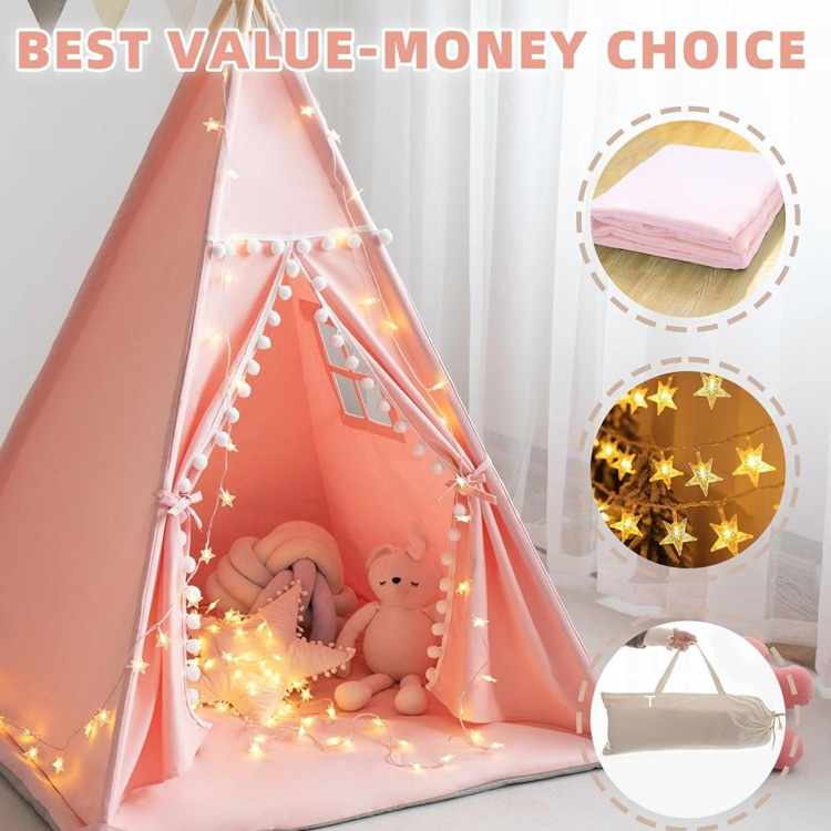 Baumwoll-Canvas-Spielhaus für Kinder, Tipi-Zelt für Kinder mit Matte. Ihr ultimativer magischer Spielraum für kreative Abenteuer. Dieses Tipi-Zelt aus Baumwollsegeltuch enthält eine bequeme Matte, bezaubernde Sternenlichter und eine praktische Tragetasche. Perfekt, um fantasievolles Spielen anzuregen und bleibende Kindheitserinnerungen zu schaffen.