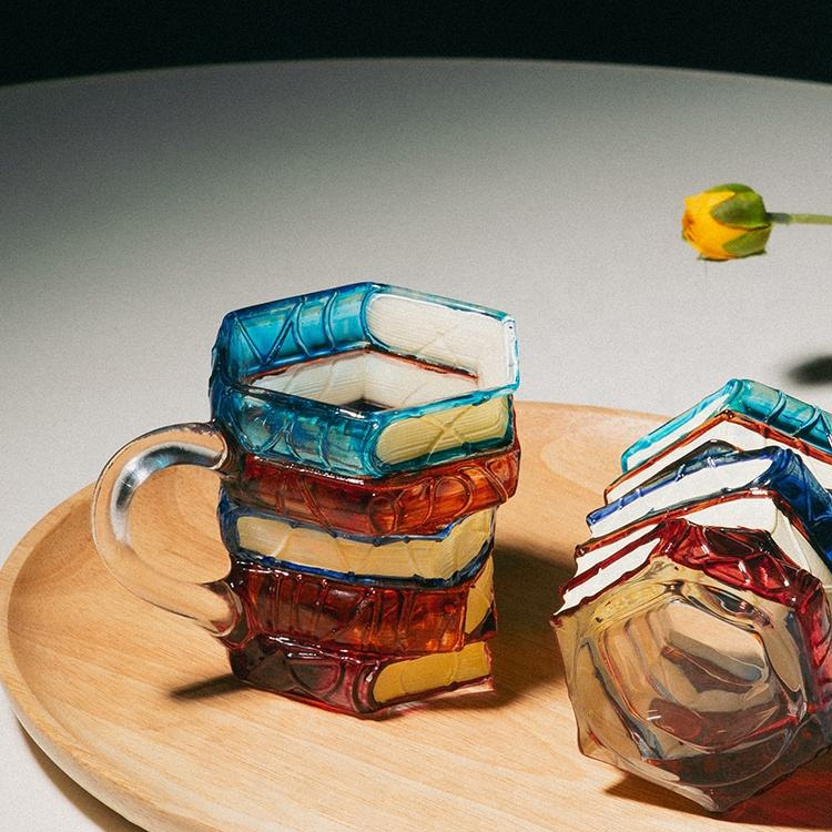 Handbemalte Kaffeetasse aus Glas, 3D-gemalte Buch-Kaffeetasse. Handbemalte Buch-Kaffeetasse aus Glas mit einem einzigartigen 3D-gestapelten Buch-Design, perfekt für Buchliebhaber und Kaffee-Enthusiasten. Robuste Glaskonstruktion mit lebendigen Farben, was es zu einem idealen Geschenk oder Dekorationsstück für Zuhause und Büro macht.