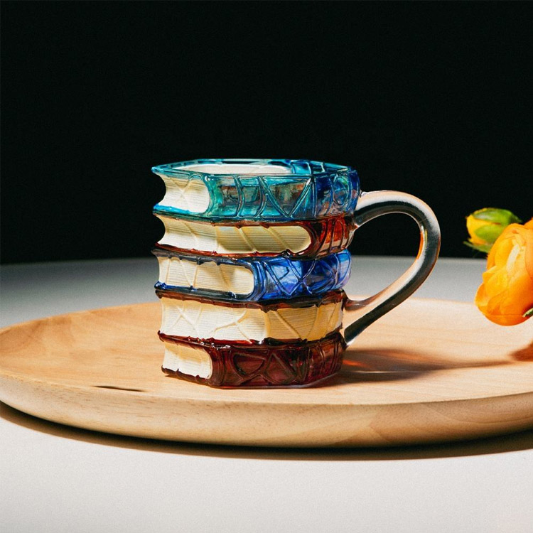 Handbemalte Kaffeetasse aus Glas. 3D-gemalte Buch-Kaffeetasse