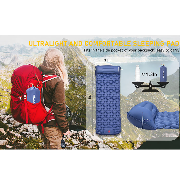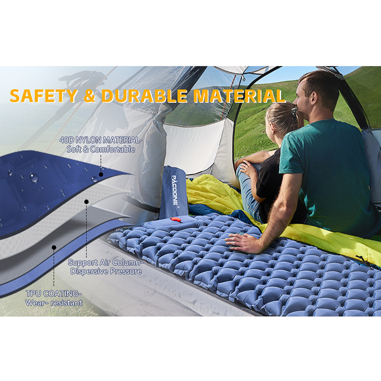 Leichte, zusammenklappbare Campingzelt-Isomatte aus Nylonmaterial. Ihre ultimative tragbare Schlaflösung für Outdoor-Abenteuer. Diese ultraleichte aufblasbare Matratze verfügt über ein Aufblasen mit nur einem Druck und ein integriertes Kissendesign. Hergestellt aus strapazierfähigem Nylonmaterial, bietet es hervorragenden Komfort beim Wandern und Camping und sorgt überall für erholsame Nächte.