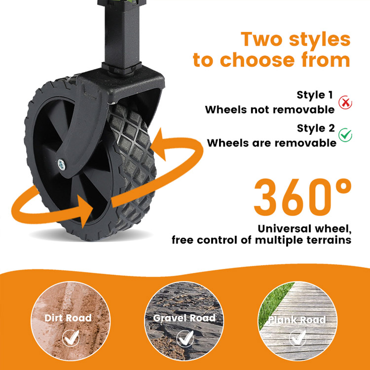 Dieser Mehrzweckwagen ist mit einem verstärkten Eisenrahmen und einer Rostschutzbeschichtung ausgestattet und bietet eine außergewöhnliche Haltbarkeit. Er trägt Lasten von bis zu 150 kg und bietet zuverlässige Leistung auf unterschiedlichem Gelände.