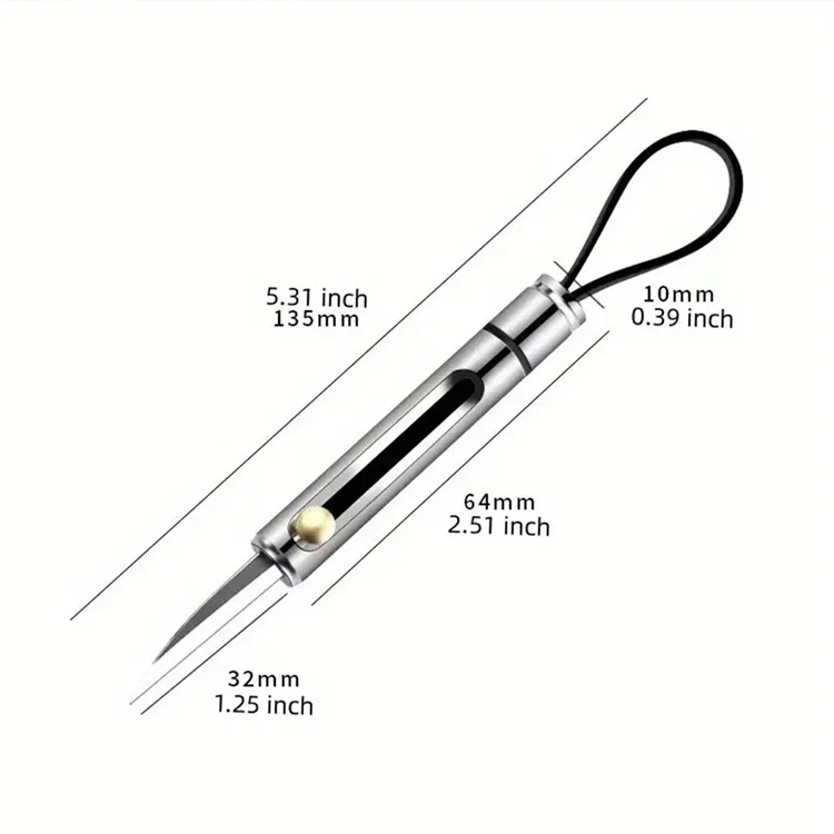 Mit einer Größe von nur 2,5 Zoll und einem Gewicht von nur 0,8 Unzen lässt sich dieses Werkzeug nahtlos an Ihrem Schlüsselbund oder Rucksack befestigen und stellt sicher, dass Sie immer eine Schneidlösung zur Hand haben.