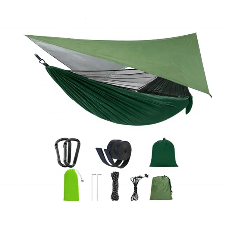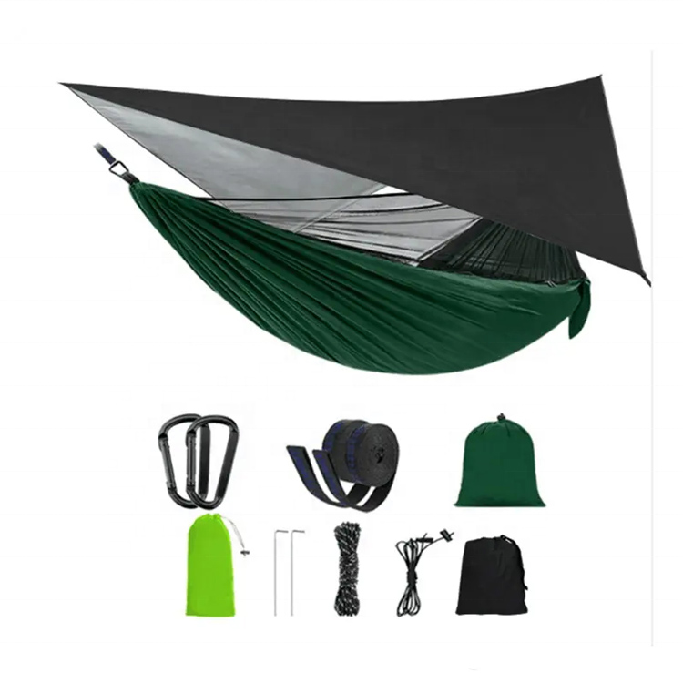 Ultraleichte Schaukel-Camping-Moskitonetz-Regenfliegen-Hängematte. Ihre ultimative Allwetter-Hängemattenlösung für Outdoor-Abenteuer. Dieses ultraleichte System kombiniert eine bequeme Schaukelhängematte mit integriertem Moskitonetz und schützendem Regenschutz. Perfekt für Camping, sorgt es für lärmfreie Entspannung und trockenen Komfort unter verschiedenen Bedingungen.