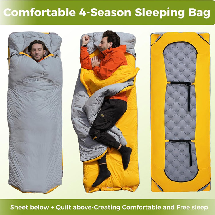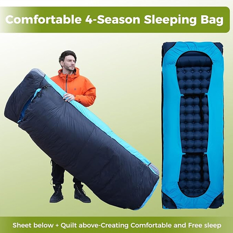 Ultraleichte Daunen-Campingdecke, Entendaunen-Isomatte. Ihr ultimatives Vier-Jahreszeiten-Schlafsystem für Abenteuer in der Wildnis. Dieser ultraleichte Daunenschlafsack kombiniert hochwertige Entendaunenisolierung mit einer integrierten aufblasbaren Unterlage. Es fungiert sowohl als Steppdecke als auch als Schlafsack und bietet maximale Wärme ohne Kompromisse beim Gewicht.